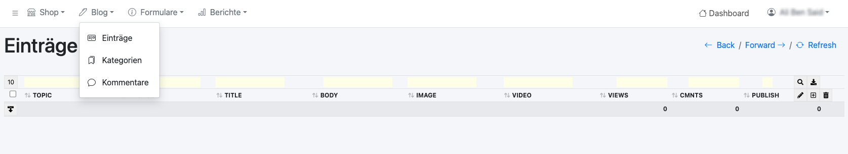 In Ihrem Blog-Menu haben Sie die Möglichkeit drei verschiedene Unter-Bereiche zu verwalten: